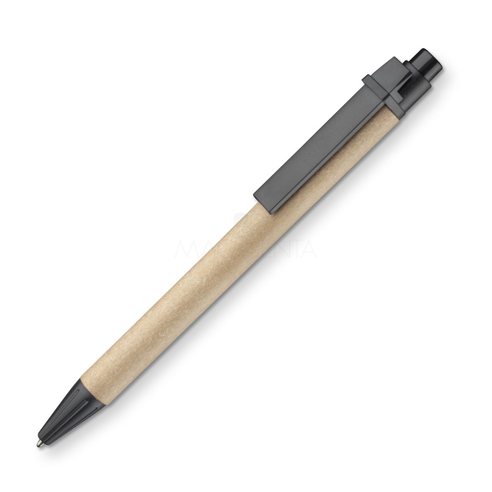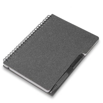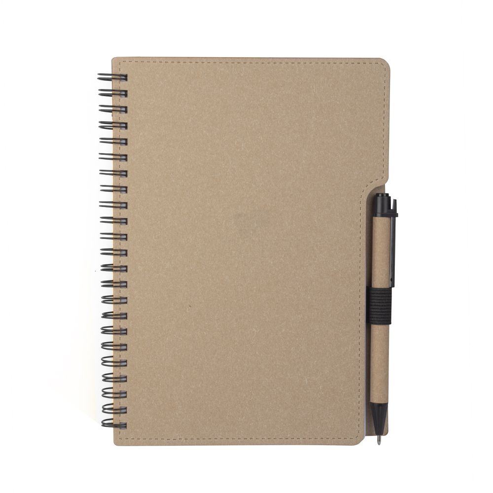Caderno de anotações em papelão reciclável com suporte para caneta e miolo de 70 folhas pautadas e destacáveis. Acompanha caneta com corpo em papel reciclável com detalhe em plástico.