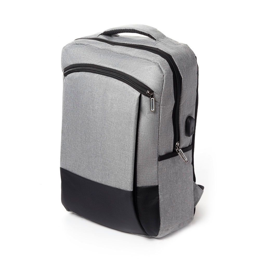 Mochila para notebook em tecido poliéster, sua parte externa contém bolso frontal com zíper, bolso pequeno na lateral direita, conector USB., alça de mão e ombro acolchoada e a parte interna com compartimento acolchoado para notebook até 15.6", porta caneta e porta objeto.