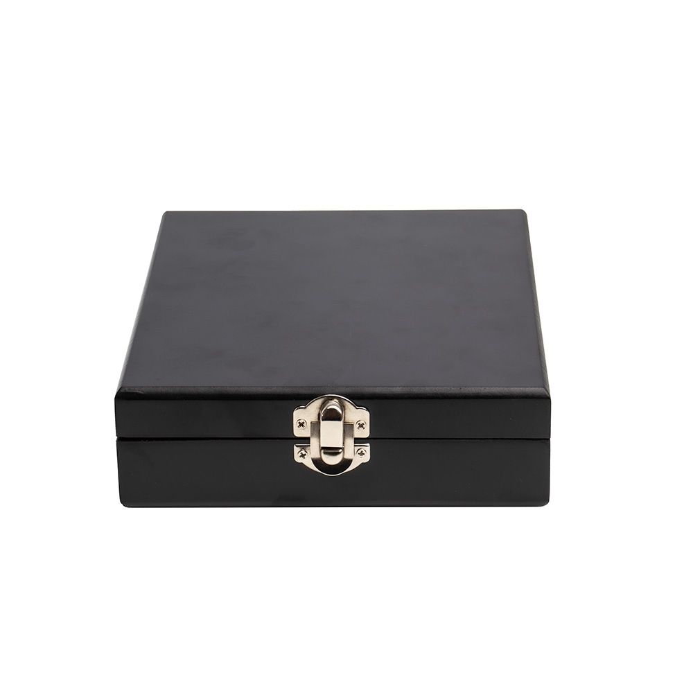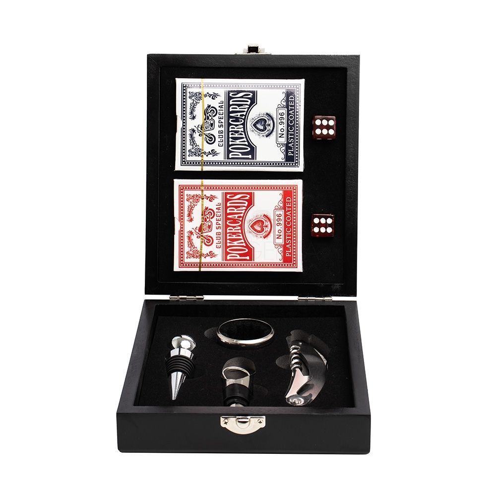 Se divirta enquanto degusta um bom vinho! Nosso kit vinho com 4 peças vem em um estojo feito em MDF com trava de segurança e área interna com berço de espuma. Contém wine collar, tampa de bico, bico condutor com tampa e saca-rolhas metálico com lâmina de corte e abridor de garrafa. Acompanham ainda 2 baralhos completos + 2 dados para uma noite completa de jogos, e ainda acompanha uma plaquinha metálica para personalização. Azar é ainda não ter um kit desse!