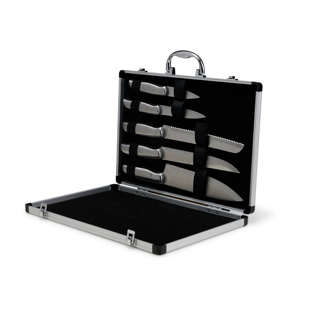 A solução ideal para quem valoriza qualidade nos cortes e organização na cozinha. O kit inclui 5 facas em aço inoxidável, com diferentes tamanhos, perfeitas para uma experiência gourmet. Acompanha uma maleta de alumínio texturizado, com interior revestido de veludo e duas travas que garantem maior segurança. Além disso, a maleta oferece espaço para personalização, tornando o kit ainda mais exclusivo.