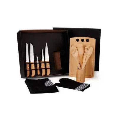 Composto por tábua, colher, colher perfurada, espátula perfurada, espátula quadrada de 30 cm e porta utensílios em Bambu; faca 7", faca Santoku, faca para pão e faca para legumes em Bambu/Inox; faca 5" para desossar em Madeira/Inox; Luva e avental em Brim.