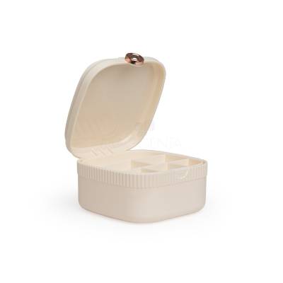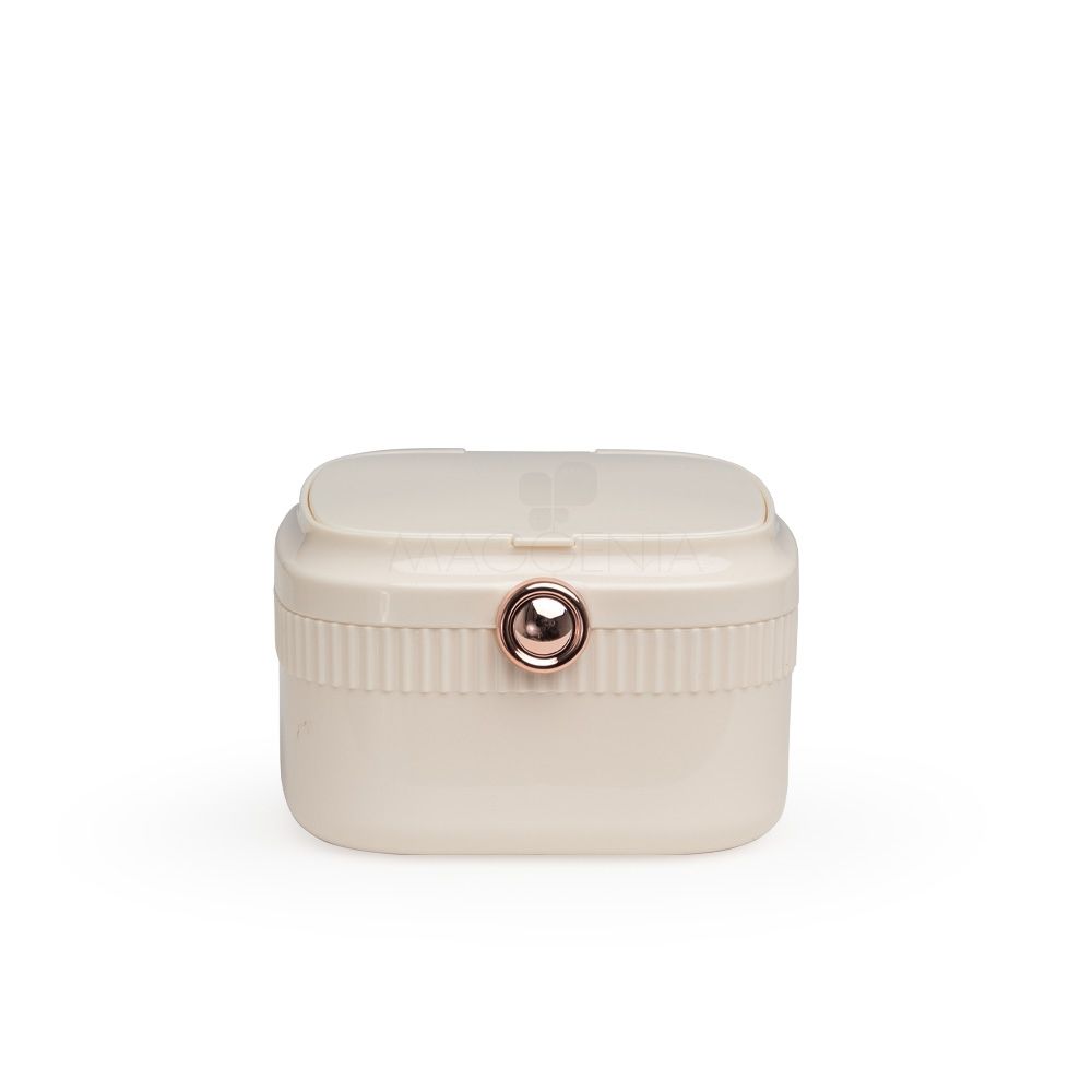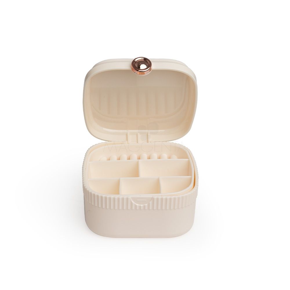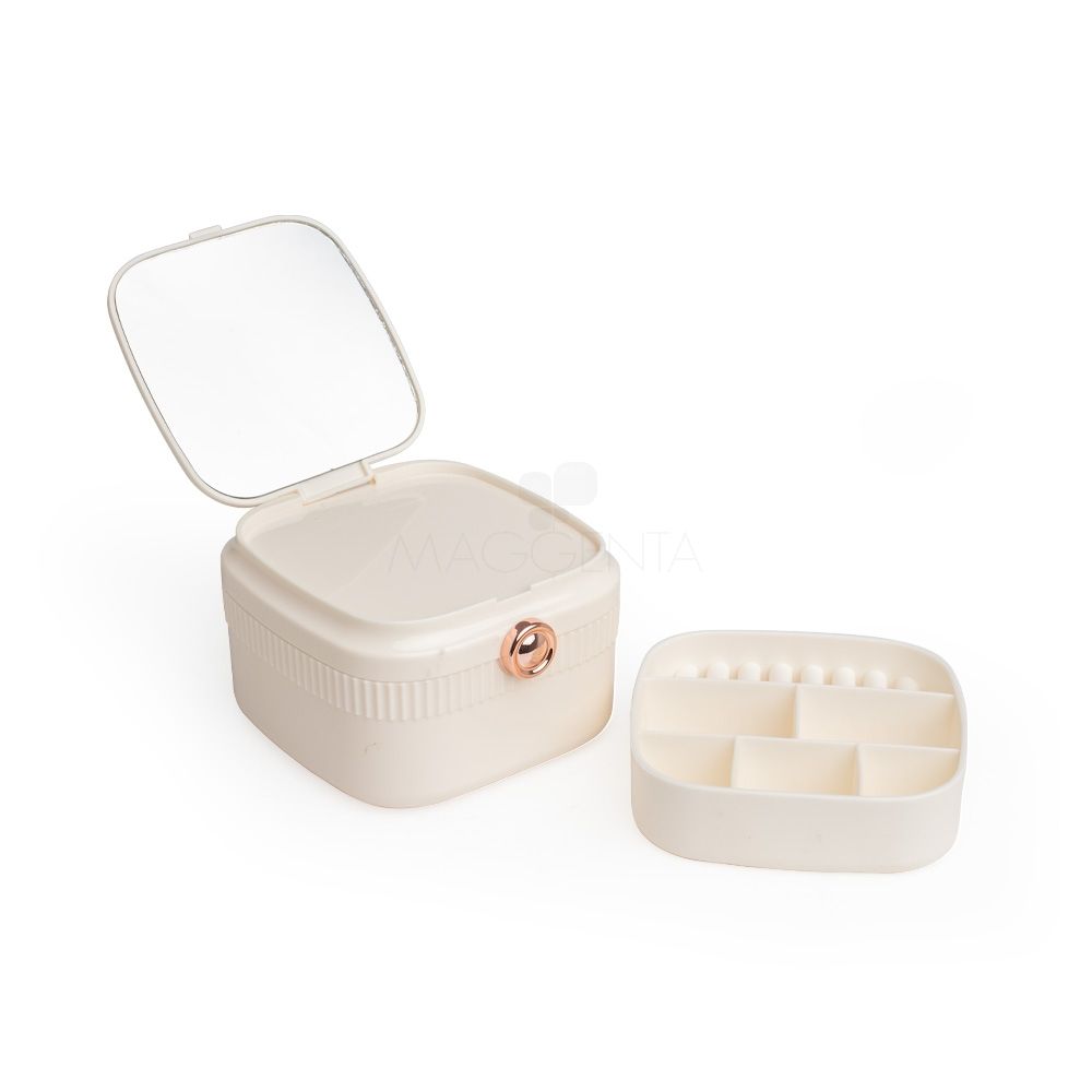 Suas joias merecem um lugar especial, e com este porta-joias, manter os acessórios organizados e protegidos nunca foi tão fácil e elegante. Produzido em plástico e de design compacto, sua abertura principal é cheia de glamour, destacada por um lindo botão na cor rose gold. Sua parte interna conta com três compartimentos: um removível e emborrachado, ideal para anéis, brincos e colares, e outro com divisória, perfeito para itens maiores como batons, pulseiras ou o que mais desejar. Além disso, possui um compartimento com espelho embutido, tornando o momento de se arrumar ainda mais especial na hora de escolher os acessórios.