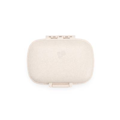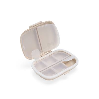 Porta-comprimidos compacto feito em plástico obtido da palha de trigo e anel de vedação para as bordas em silicone. Possui oito compartimentos com tampas removíveis, sendo dois maiores com capacidade de até 30ml e seis menores com até 10ml cada. Acompanha palheta multiuso.