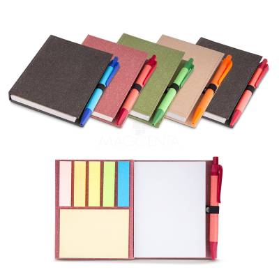 Bloco de anotações ecológico personalizado com capa em papel kraft. Possui 1 bloco para anotações com aproximadamente 100 folhas brancas, 25 folhas adesivas amarelas, 5 marcadores de páginas coloridos com 25 unidades de cada cor e porta caneta lateral. Ótima opção para divulgação de sua empresa utilizando o logotipo gravado no produto para distribuição em eventos promocionais, brindes corporativos e campanhas de marketing.