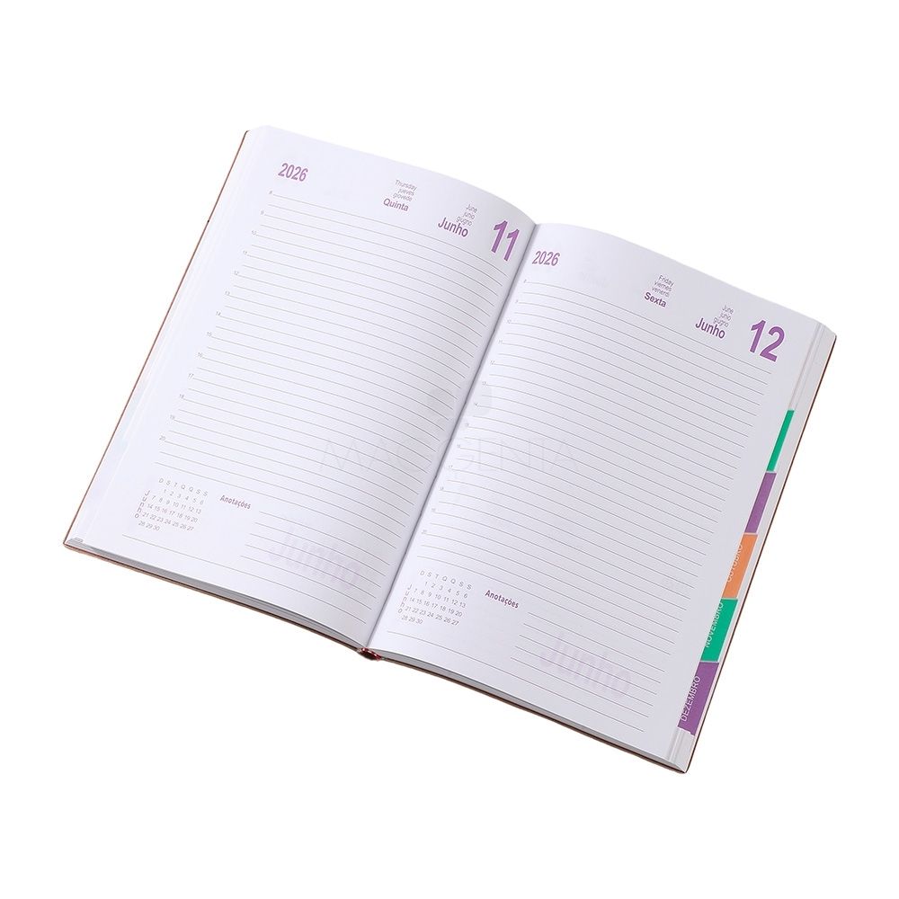 Agenda 2026 de couro sintético com abas mensais e marcador de página em cetim. Contém folhas para dados pessoais, calendários 2026 à 2028, planejamento 2026, DDI, página de conversões e páginas de contatos.
