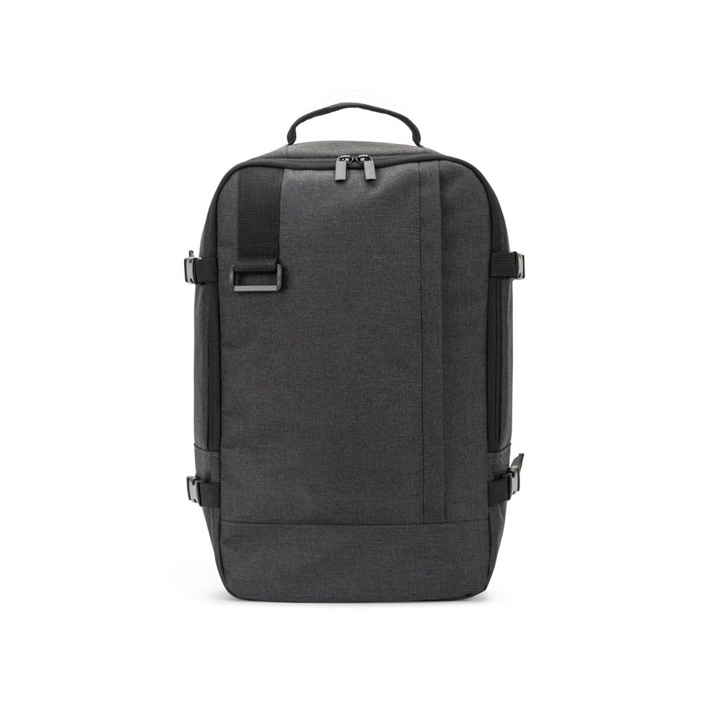 Mochila desenvolvida para cumprir as dimensões exigidas pelas companhias aéreas, permitindo-lhe viajar com tudo o que necessita como bagagem de mão. Composta em poliéster reciclado (rPET) 600D de alta densidade, com acabamento repelente à água, e forro em poliéster reciclado (rPET) 210D. Possui um compartimento principal amplo para roupa, um compartimento totalmente almofadado para um notebook até 14" e um bolso frontal.