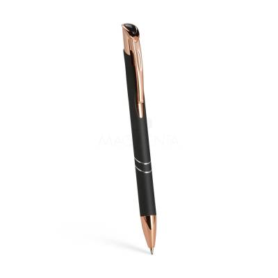 Caneta metálica com detalhes em plástico, acionamento por clique e carga esferográfica azul de 1.0mm, o que proporciona uma pegada leve e uma escrita precisa.