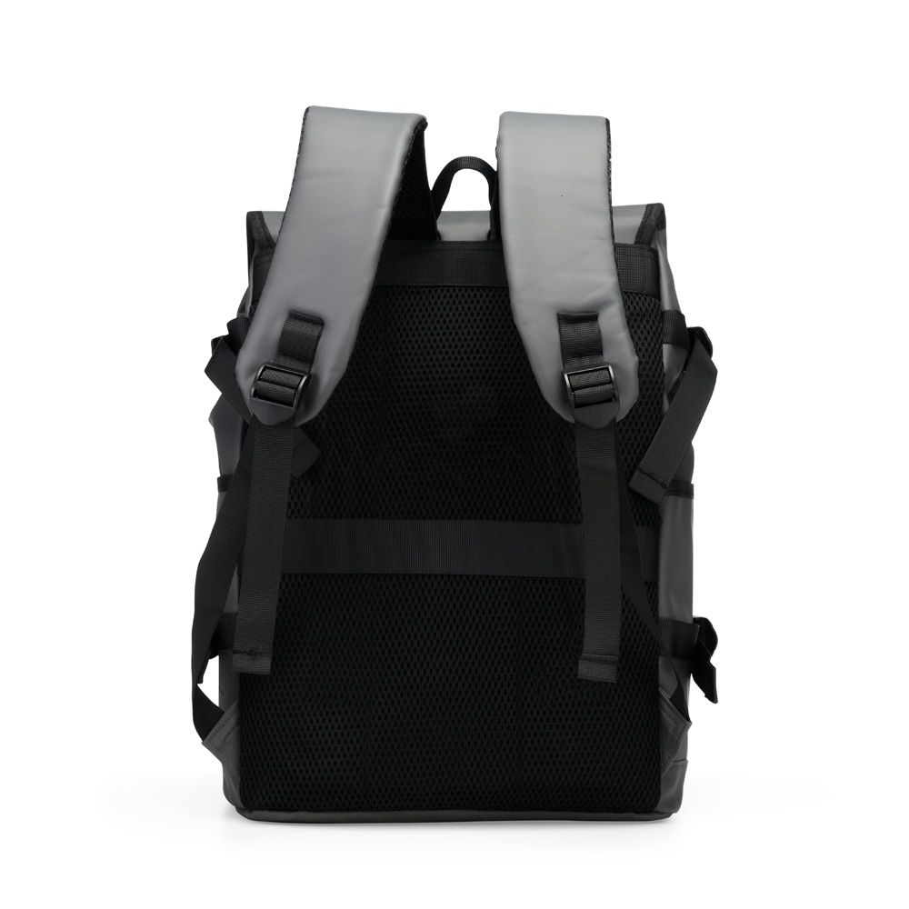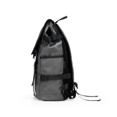 Mochila confeccionada em couro sintético com capacidade máxima de 18 litros. Possui abertura com zíper, tiras frontais em velcro e engate rápido. Apresenta divisória interna para notebook de até 15,6 polegadas, além de dois bolsos laterais e dois frontais, sendo um com fechamento em zíper próximo à abertura. Conta ainda com alças ajustáveis, costas acolchoadas em espuma respirável e engate traseiro para malas.