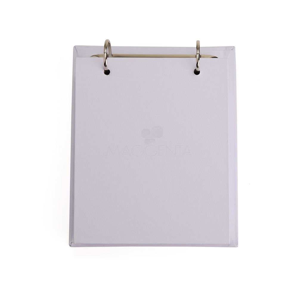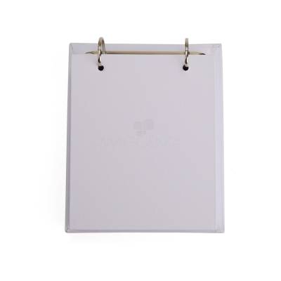 Bloco de anotações de mesa com trilho de ferro e capa dura em percalux. Possui aproximadamente 150 folhas brancas sem pauta com área destacável.