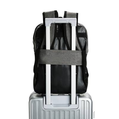 Mochila confeccionada em Poliéster PVC mescla com detalhes em couro sintético e capacidade de até 11 litros. Apresenta divisória interna em tecido telado respirável, ideal para notebooks de até 14 polegadas. Possui compartimento frontal com fechamento em zíper, duas alças para as costas, uma alça de mão e engate posterior para malas de viagem.