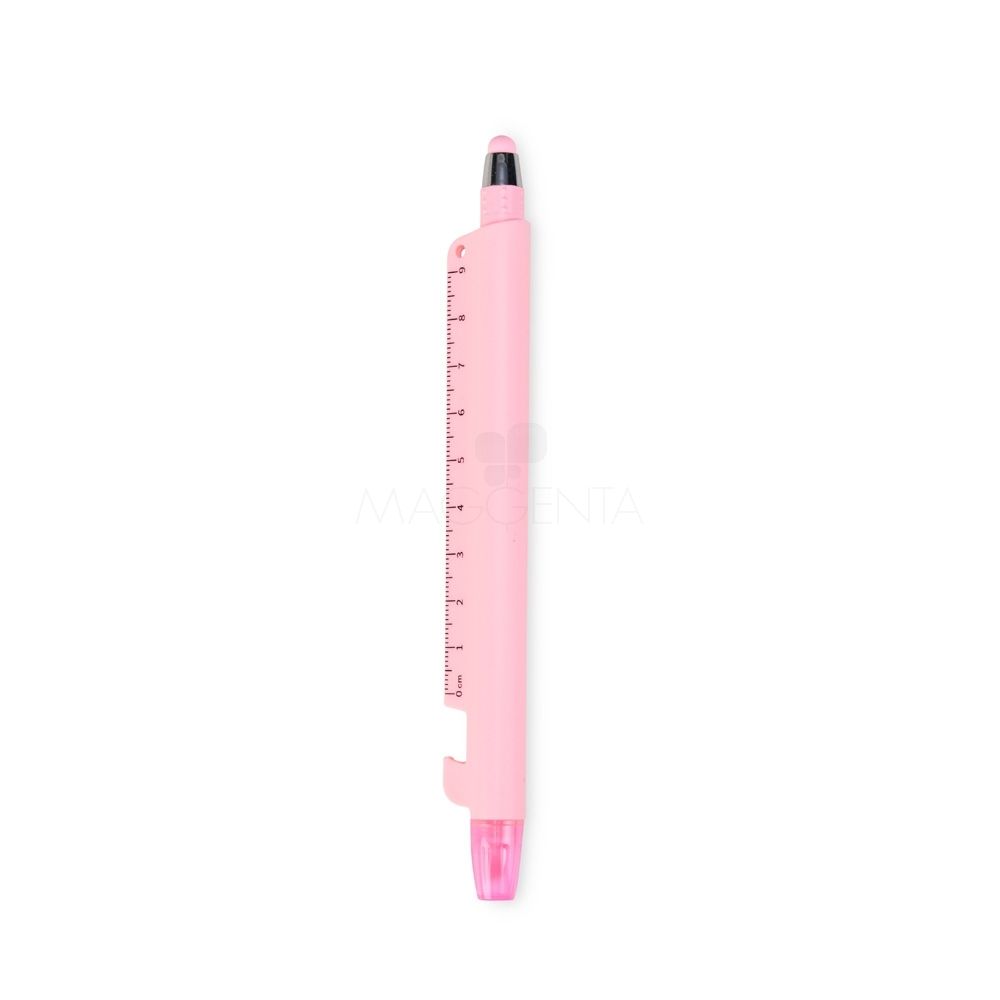 Caneta plástica marca-texto de ponta chanfrada com tampa protetora. Conta com uma régua de 9 centímetros e abridor de garrafas integrados ao corpo da caneta, além de uma caneta menor, destacável da estrutura principal, com ponteira emborrachada para interação com telas sensíveis ao toque e carga esferográfica azul de 1.0mm