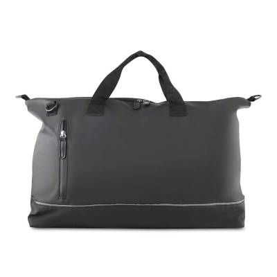 Mala esportiva em PU com revestimento interno em poliéster 210D. Possui faixa refletiva, bolso frontal com zíper, alça de mão e alça de ombro ajustável, além de dois compartimentos internos.