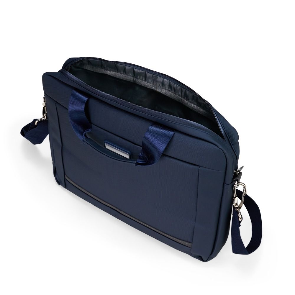 Pasta para notebook confeccionada em couro sintético impermeável com fechamento em zíper e capacidade para aparelhos de até 15,6 polegadas. Possui dois compartimentos: o principal, com revestimento acolchoado, quatro bolsos abertos de tamanhos diferentes e duas divisórias para canetas; e o frontal, com plaquinha metálica fixa na parte externa. Conta ainda com duas alças de mão e um par de abas metálicas para alças removíveis. Acompanha alça de ombro ajustável.