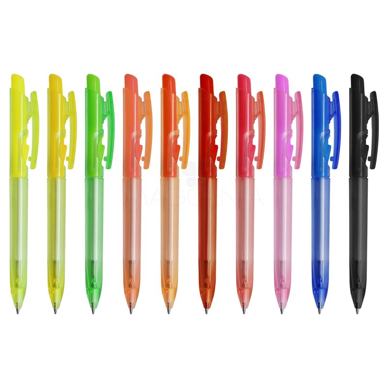 Caneta plástica translúcida promocional, retrátil, com clip e escrita super macia. Consultar as cores disponíveis. Gravação em silk.