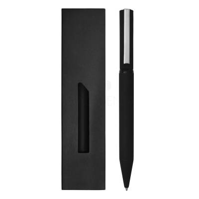 Caneta de metal personalizada giratória e carga azul. Acondicionada em embalagem de cartonagem.