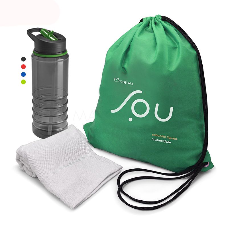 Kit fitness personalizado ideal para academias. Contém * 1 Saco de nylon * 1 Squeeze em plástico resistente com bico ajustável * 1 Toalha fitness.