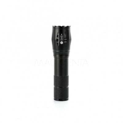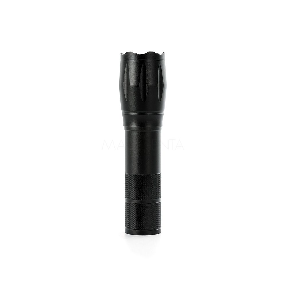 Lanterna led recarregável com zoom de regulagem e três estágios de iluminação, material metálico. Acompanha cordão de nylon e cabo USB-V8.