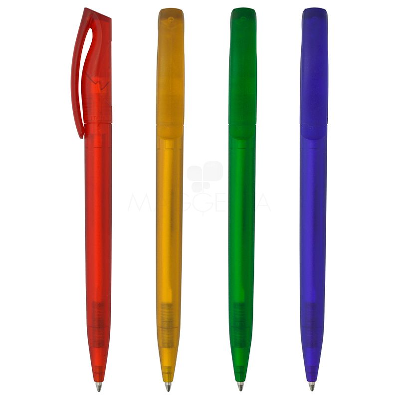 Caneta plástica esferográfica para dar de brinde. Possui acabamento frost, tinta Dokumental na cor azul, 2km de escrita e acionamento giratório.