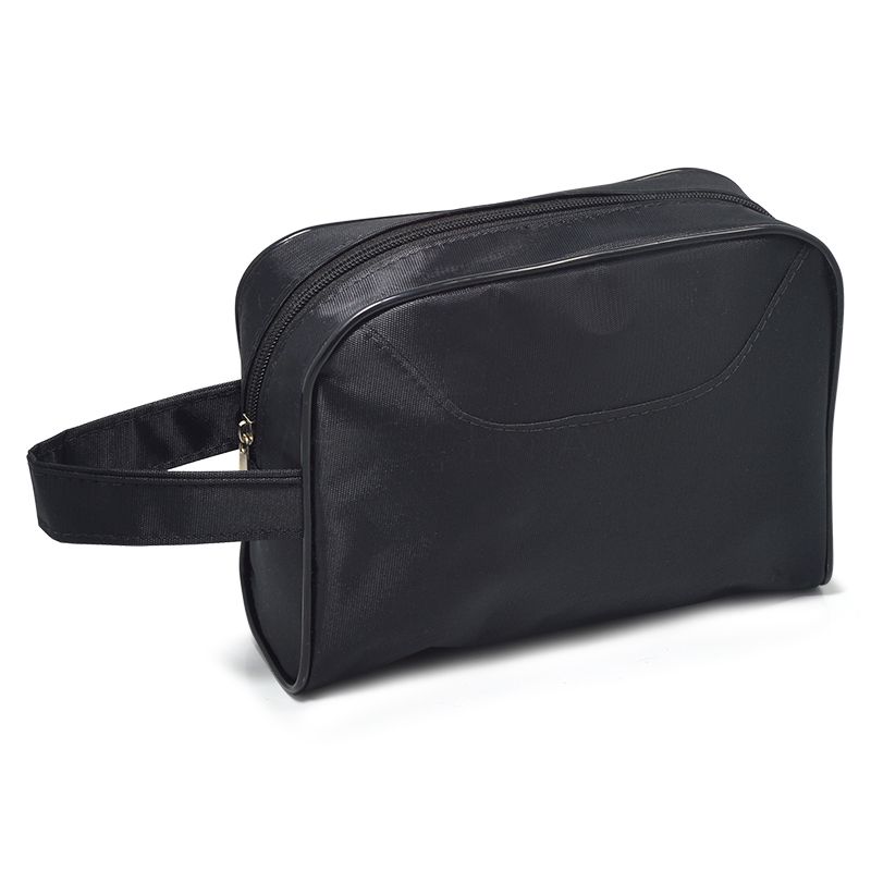 Necessaire para brindes personalizados. Confeccionada em Nylon, possui alça de mão e compartimento único para acomodar acessórios de higiene pessoal.