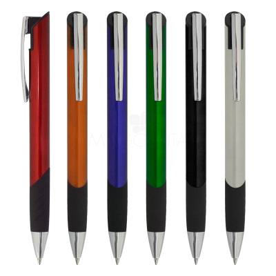 Caneta esferográfica plástica para brindes corporativos. Possui apoio emborrachado para uma escrita mais confortável, acionamento por clique e carga azul. Consultar cores disponíveis. Gravação em Silk.