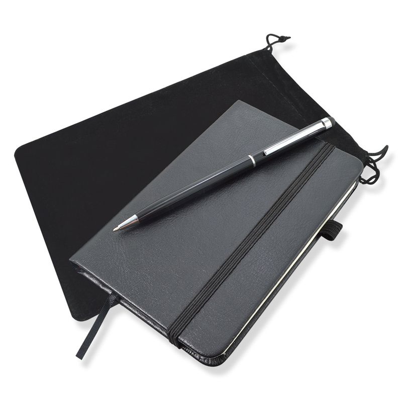 Conjunto escritório com um bloco de anotação com 80 folhas pautadas, capa e contra capa em couro sintético, marca páginas, um caneta de metal esferográfica com ponteira touch e um estojo de veludo com fecho de cordão.