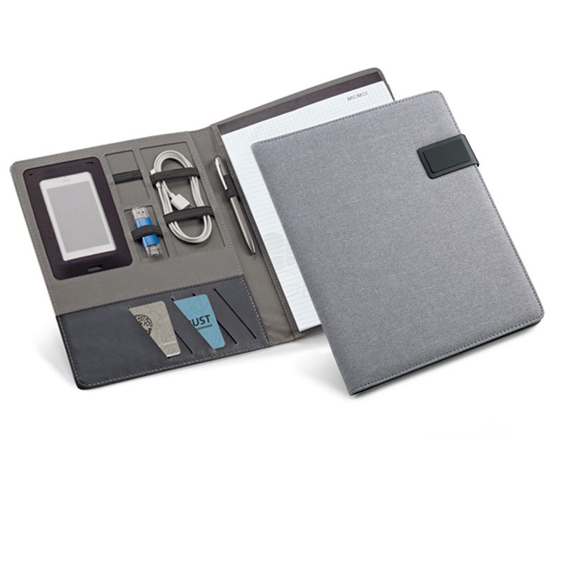 Linho sintético e couro sintético. Fecho magnético. Bloco: 20 folhas pautadas. Chapa metálica com acabamento emborrachado. Esferográfica e pen drive não inclusas.
