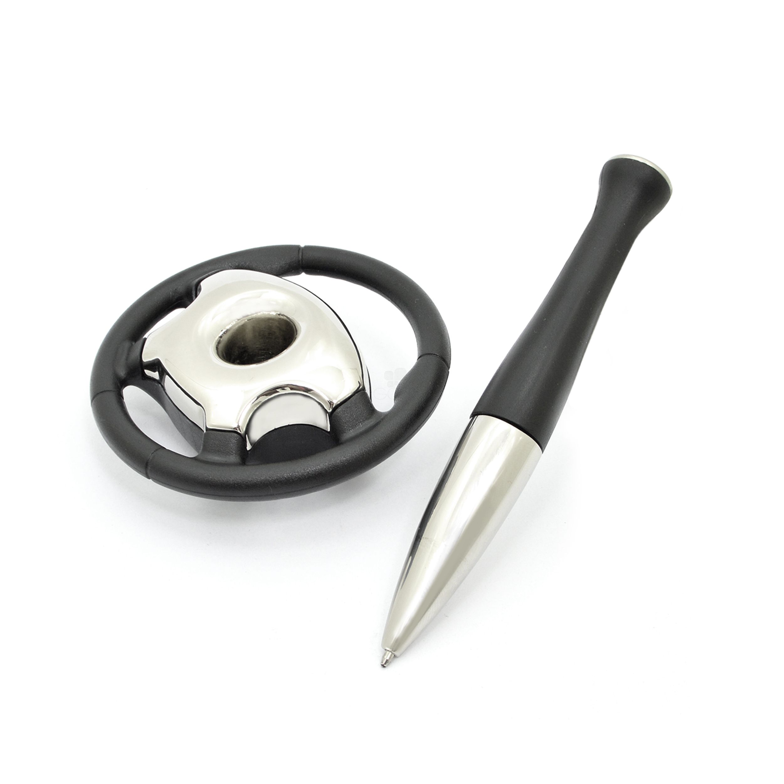 Porta caneta no formato volante de carro acompanhado de uma caneta esferográfica na cor preta com detalhes de metal.