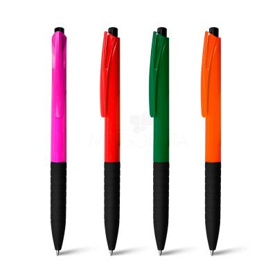 Caneta plástica personalizada com detalhe emborrachado que proporciona uma escrita macia e confortável, possui clip personalizado e sistema de acionamento da ponteira através do click