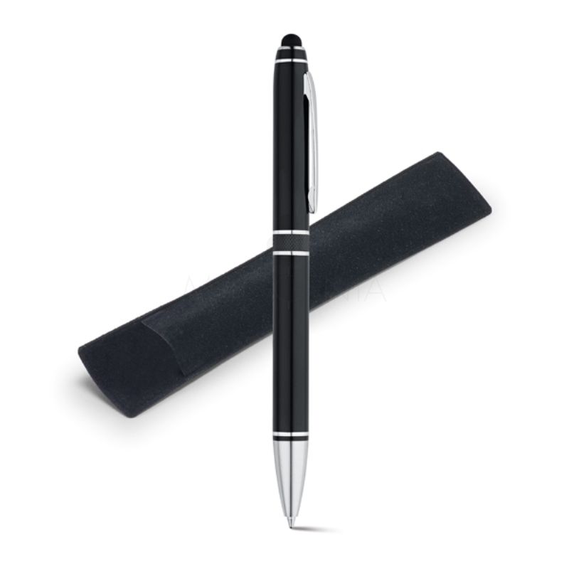 Caneta de metal personalizada com escrita macia e confortável, Possui detalhe no corpo da caneta em metal, embalagem em veludo e 1 ponteira touch para uso em tablets e smartphone.