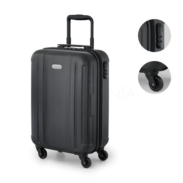 Mala de viagem executiva personalziada produzida em ABS com, Interior forrado com divisória interna, 4 rodas giratórias, alça extensível em alumínio (altura da alça estendida: 500 mm). Fecho de segurança com senha e placa metálica removível com imã para gravação.