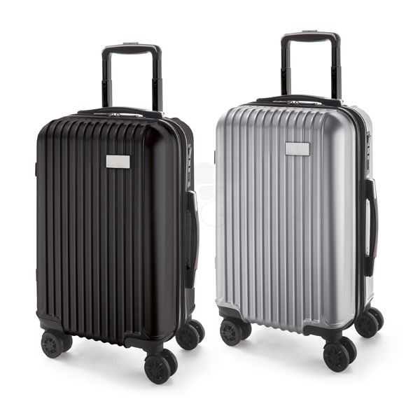 Mala de viagem executiva produzida em ABS e PET. Possui Interior forrado, com divisória, 4 rodas duplas giratórias, alça extensível em alumínio com mola (altura da alça estendida: 525 mm). Fecho de segurança com senha e chapa metálica removível para gravação.