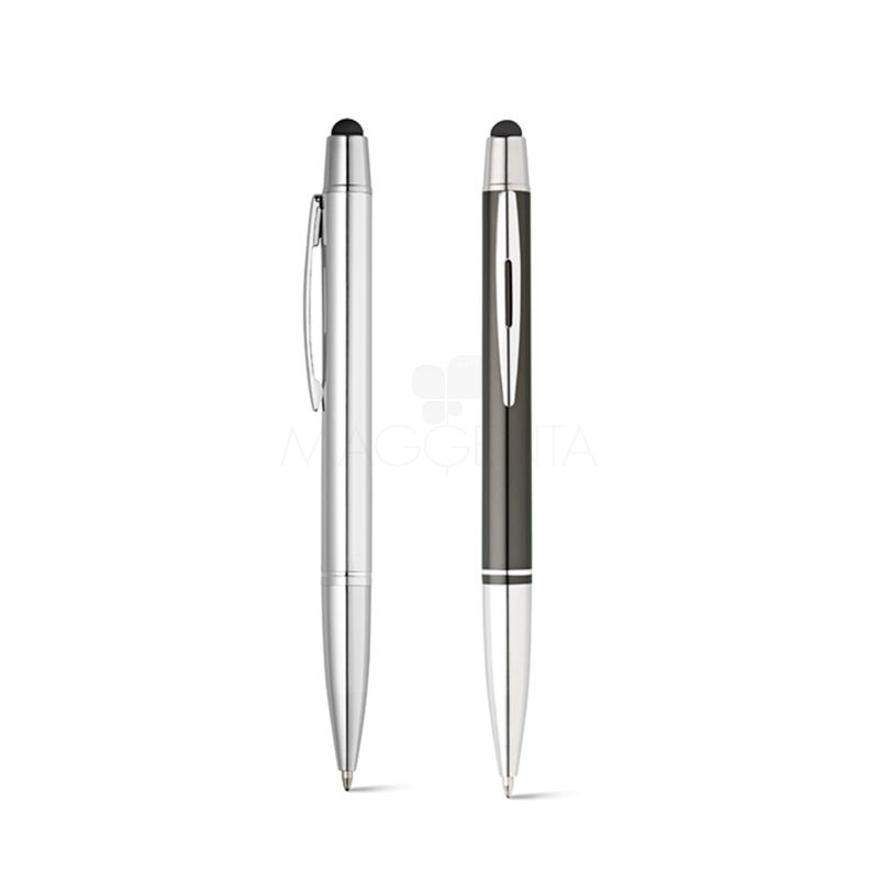 Esferográfica com escrita azul e ponteira touch que proporciona o uso em seu tablet e smartphone. Possui acabamento brilhoso elegantes ideal para eventos corporativos e brindes promocionais.