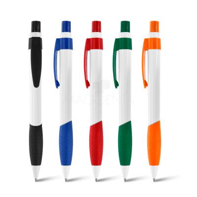 Caneta plástica personalizada com clip e detalhe emborrachado na parte inferior da caneta.