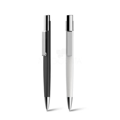 Caneta de metal personalizada com acabamento fosco, corpo triangular, esferografica na cor azul, clip de metal e acionamento da escrita por click. Ideal par abrindes promocionais e eventos corporativos.