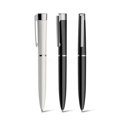 Caneta de metal personalizada com acabamento fosco, detalhe personalizado na parte superior da caneta, esferografica na cor azul, acionamento da ponta por giro e clip de metal.