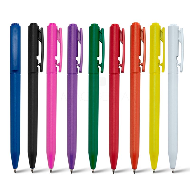 caneta plástica personalizada possui clip injetado e acionamento da ponteira na parte superior da caneta.