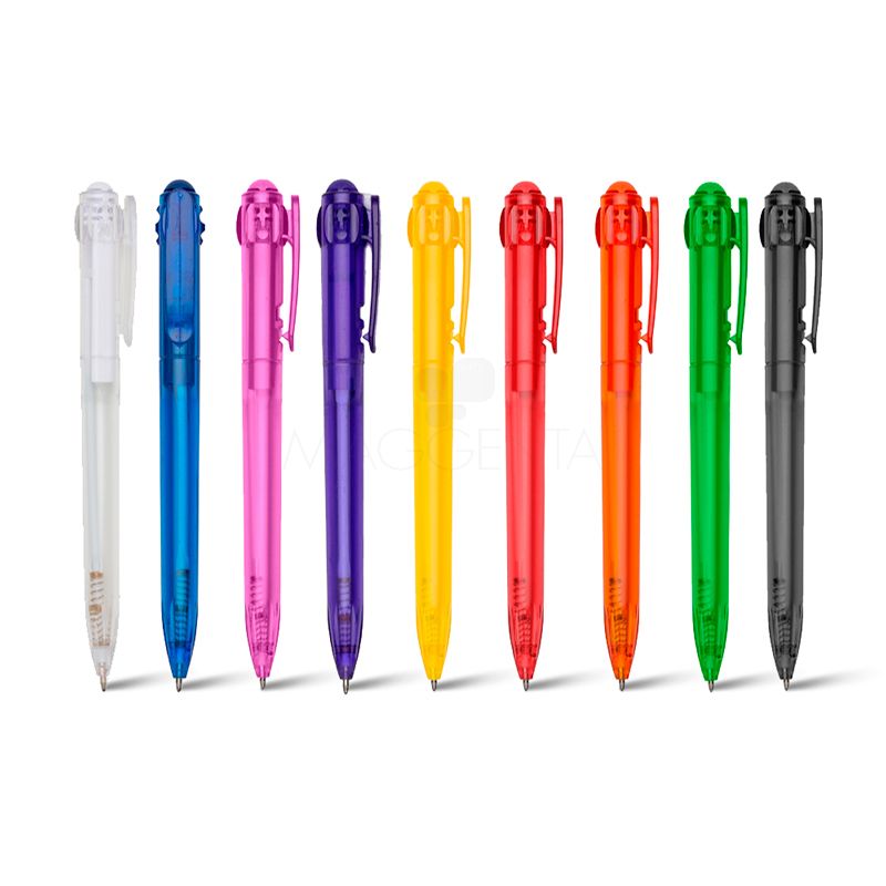 Caneta Plástica Personalizada Caneta plástica personalizada com cores translúcidas, possui clip plástico esferográfica na cor azul e click com detalhe diferenciado. Acionamento da escrita através do click.