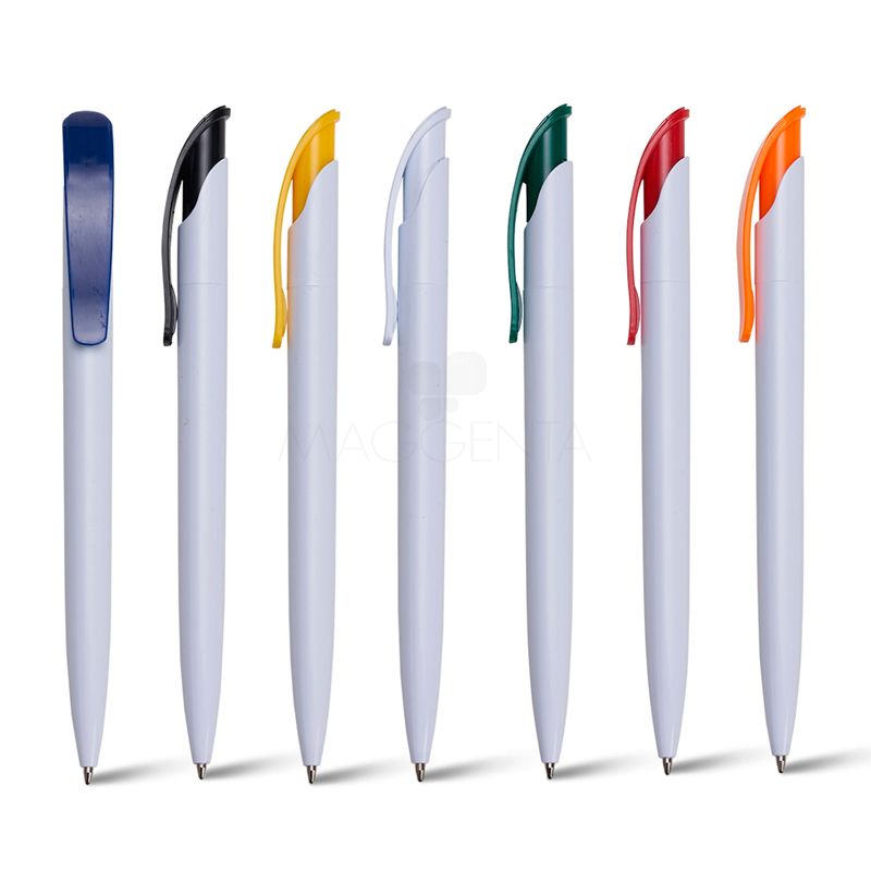 Caneta Plástica Personalizada Caneta plástica personalizada com clip curvado em um design moderno e inovador, possui esferográfica azul e acionamento da ponteira por click.