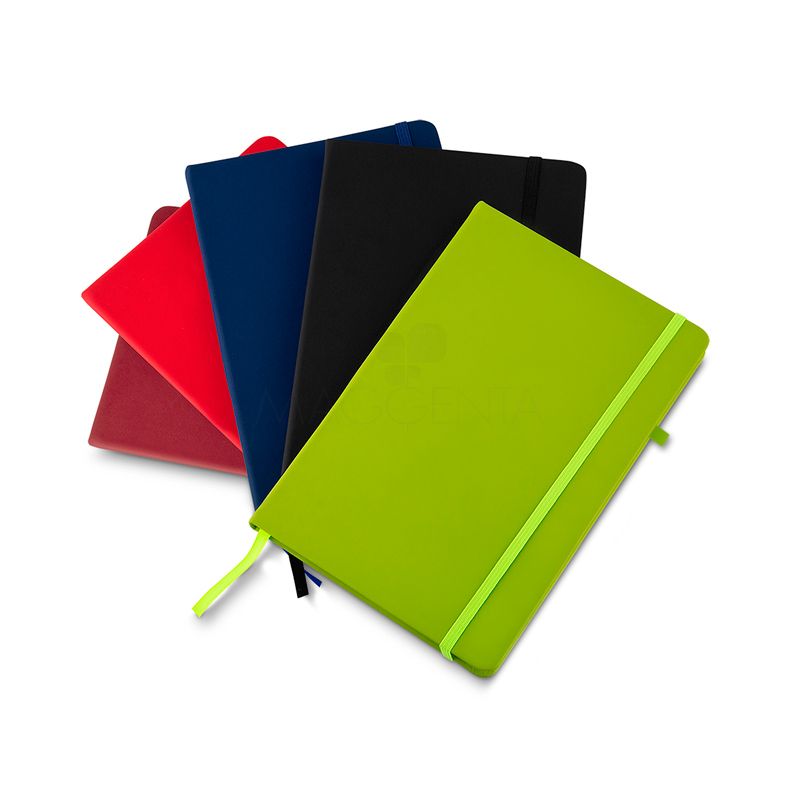 Bloco De Anotações com Pautas Personalizado Bloco de anotações personalizado com capa dura sintético, suporte para caneta, elástico para fechamento, 80 folhas pautadas na cor marfim e marcador de página. Caneta não acompanha o produto.