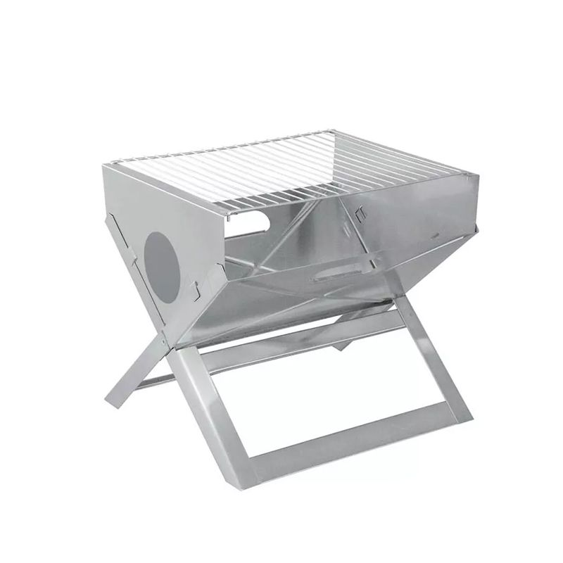 Churrasqueira dobrável produzida em material inox, possui grelha superior, lateral aberta para reposição de carvão e fechamento em formato de X.