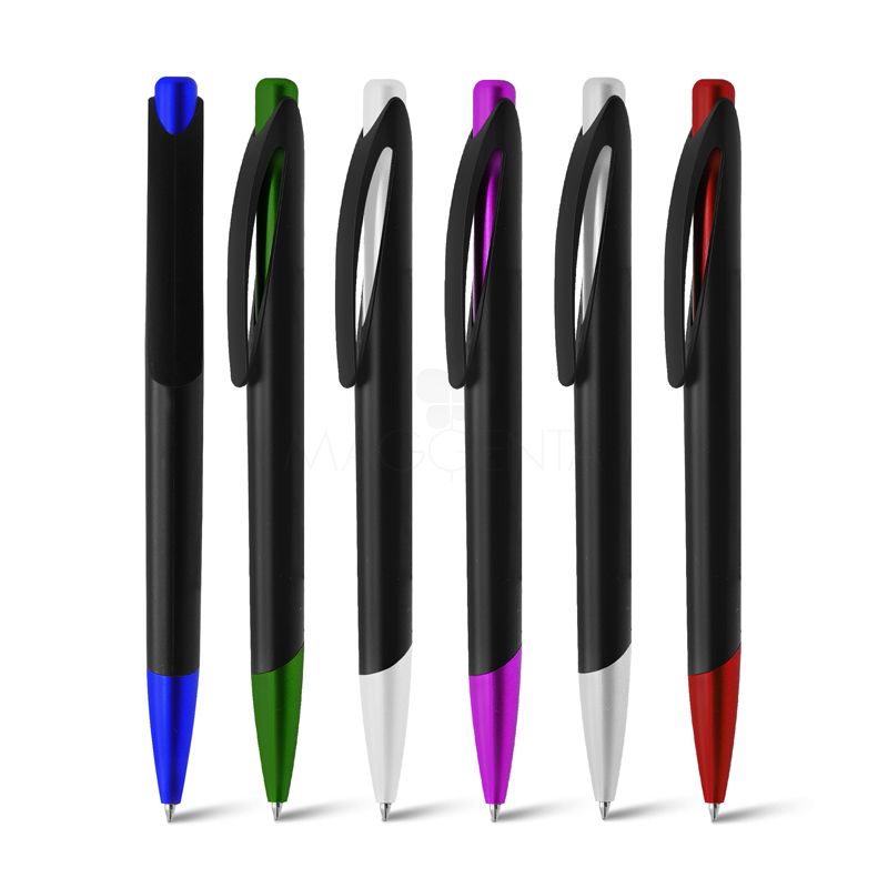 Caneta plástica personalizada, possui acionamento da ponteira na parte superior por clique, esferográfica na cor azul e clip de plástico. Ideal para brindes personalizados e eventos corporativos.