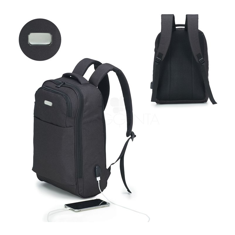 Mochila pra notebook personalizada produzida em Nylon 600D, com saída USB. Possui amplo espaço interno para notebok, 2 compartimentos frontais, alça de mão, costa e alça de ombo em espuma. Objetos decorativos nao acompanha o produto. Ideal pra brindes personalizados e eventos corporativos.