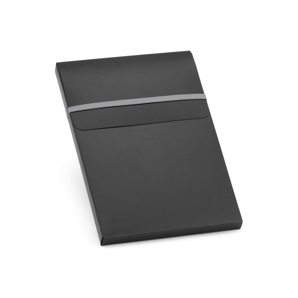 Bloco de anotações personalizado produzido em couro sintético com capa dura, possui 80 folhas não pautadas na cor branca, embalagem de pp em formato de caixa e caneta de metal esferográfica com acionamento por clik. Ideal para divulgar sua empresa em eventos corporativos, brindes personalizados e campanhas promocionais. Caneta: ø10 x 137 mm