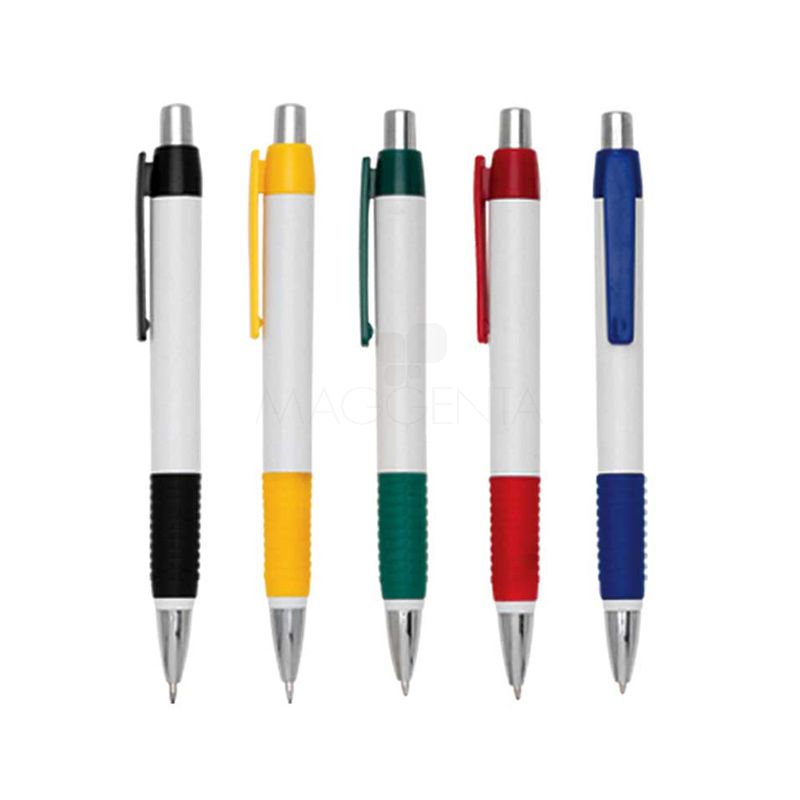 Brinde Caneta de Plástico com click injetada com corpo branco e detalhe emborrachado coloridos. Consultar as cores