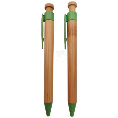Conjunto de caneta e lapiseira personalizada produzida em bambu com detalhes em fibra de trigo, possui clip com design diferenciado em formato de folha, esferográfica na cor azul com acionamento por click e embalagem em papel kraft personalizado com detalhes simulando madeira. Produto Inovador com apelo sustentável ideal para divulgar sua empresa em eventos corporativos, brindes personalizados e campanhas promocionais.