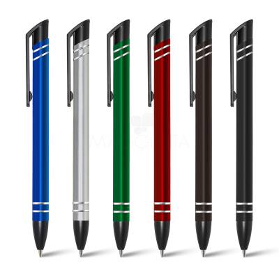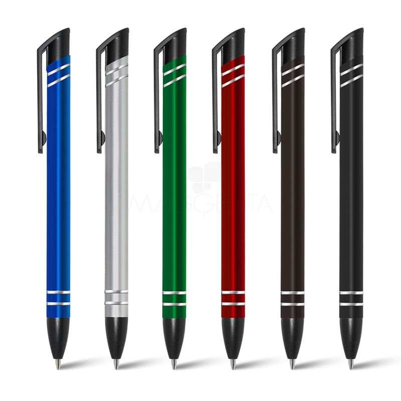 Caneta de metal personalizada com design inovador, possui detlahes em anéis prateados, clip em ABS corpo com acabamento brilhante e esferográfica azul com acionamento por click. Ideal para divulgar sua marca em brindes promocionais e eventos corporativos.