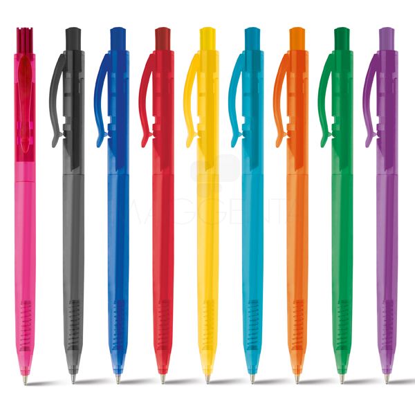 Caneta plástica personalizada com cores translúcidas. Possui escrita na cor azul, acionamento por clique e para destravar basta apertar a parte inferior do clip. Ideal para divulgar sua empresa em eventos corporativos, brindes personalizados e campanhas promocionais.