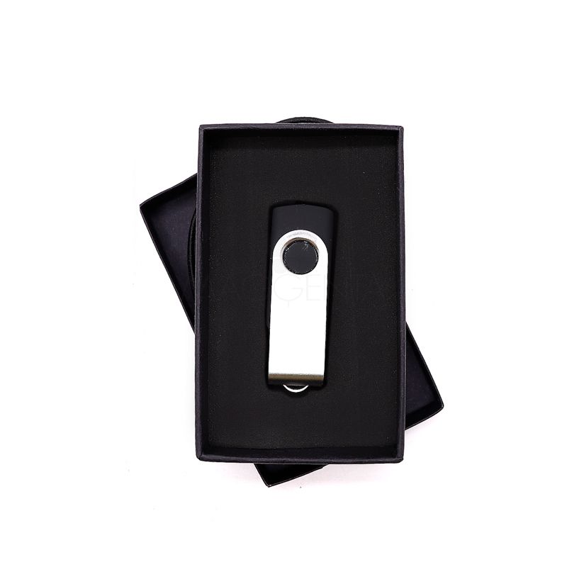 Embalagem personalizada para pendrive produzida em cartonagem preta. Possui fecho de elástico e base interna de EVA com o formato do pendrive desejado. Com um design simples e elegante é perfeita para presentear. Ideal para brindes, campanhas promocionais e eventos corporativos.