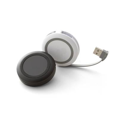 Hub carregador wireless power bank personalizado com capacidade de carregamento 900mAh, possui 2 saídas USB e base para recarga de dispositivos com acabamento antiderrapante, Entrada: DC 5V/2A e Saída (3): DC 5V/1A BASE de recarga: Entrada: DV 5V/1,5A e Saída: DV 5V. Acompanha cabo usb micro USB. Ideal para brindes promocionais e eventos corporativos.