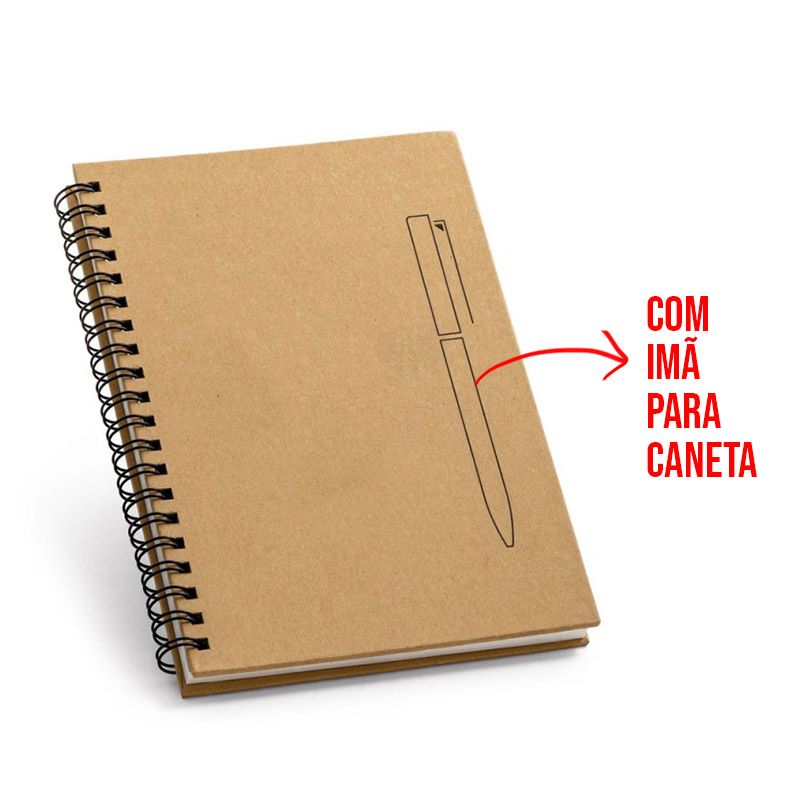 Bloco de anotações personalizado formato B6 com capa rígida em craft. Contém 140 páginas lisas em papel 120g/m² e Imã na capa que funciona como um suporte de caneta de metal (não incluída). Ideal para brindes promocionais e eventos corporativos. Objetos decorativos não acompanham o produto.